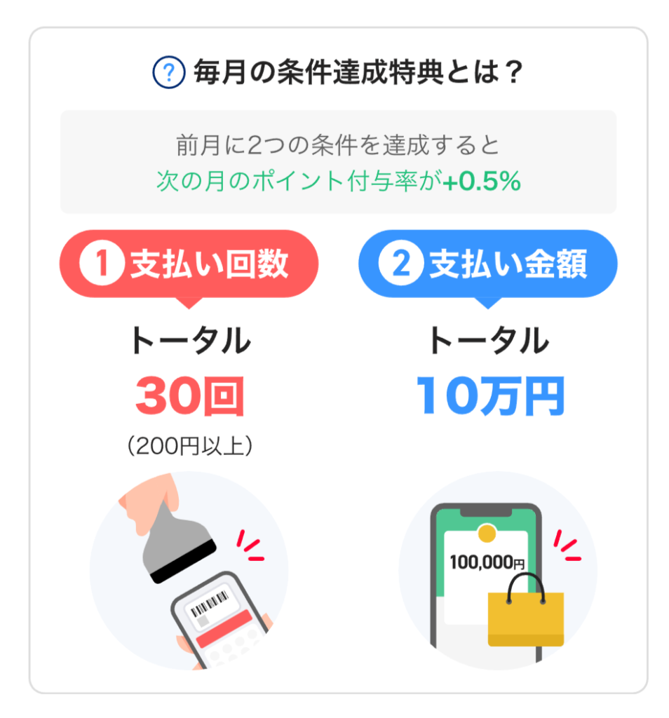 1ヶ月の間に以下の2つの条件を達成すると、翌月の還元率が+0.5%アップします。