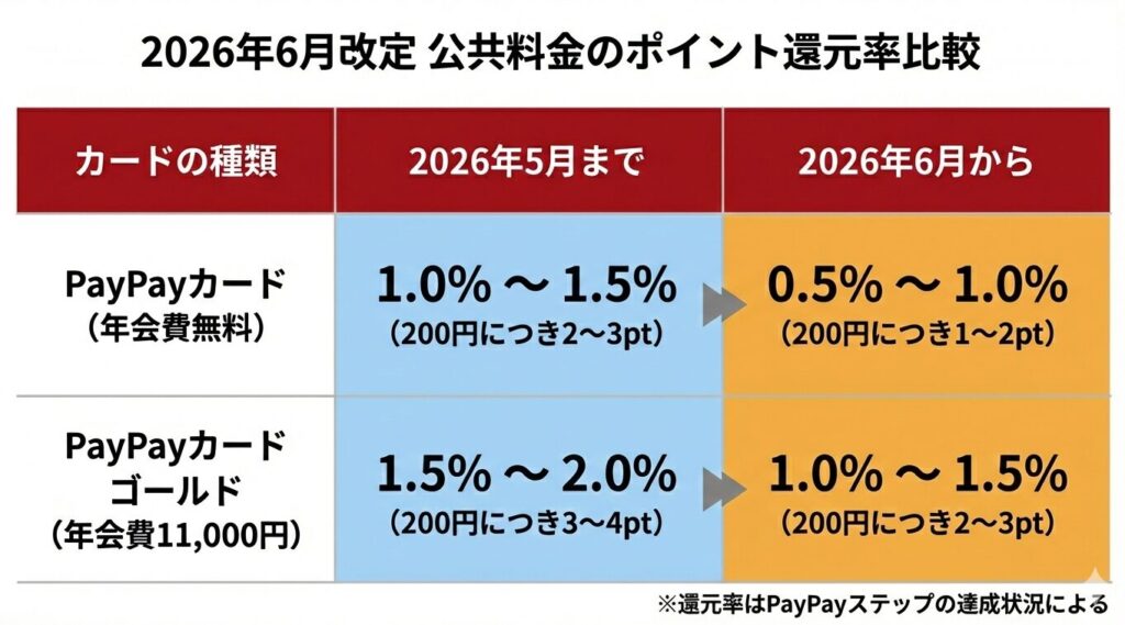 2026年6月2日より、公共料金・税金のPayPayカード支払い時の基本還元率が1%→0.5%(200円につき2pt→1pt)にダウンします。
