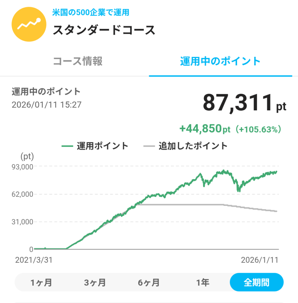 この時期からは「PayPay資産運用」へのポイント追加をスタートし、スタンダードコースは「放置運用」に切り替えました。追加は一切せず、ただ持ち続けるだけ。それでも資産はしっかり育っていきました。