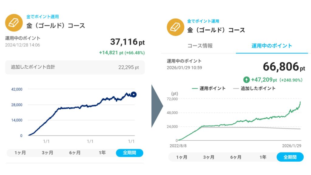 実際に私が2022年8月から3年半「ゴールドコース」を運用した結果、運用益は+240%を超えました。
