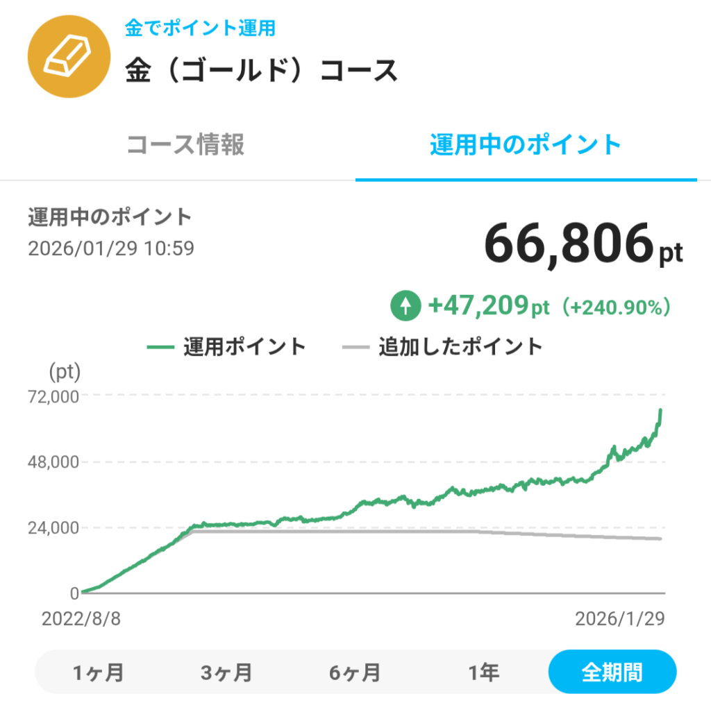 「ゴールドコース」は、短期で爆上げするような派手さはありませんが、長期目線で着実に資産を支えてくれる「縁の下の力持ち」となってくれています。