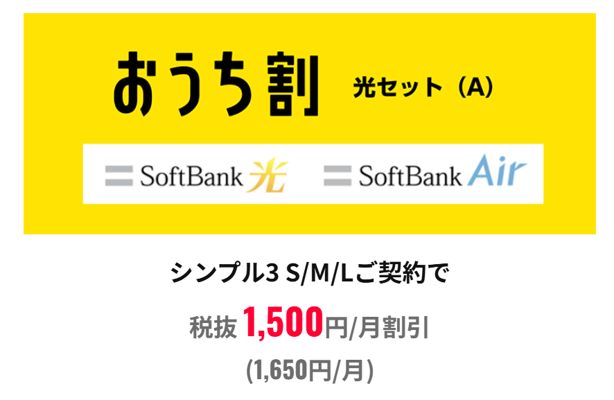 | おうち割 光セット | 1,650円/月 | 1回線目から | ソフトバンク光 ソフトバンクアAir 契約 |