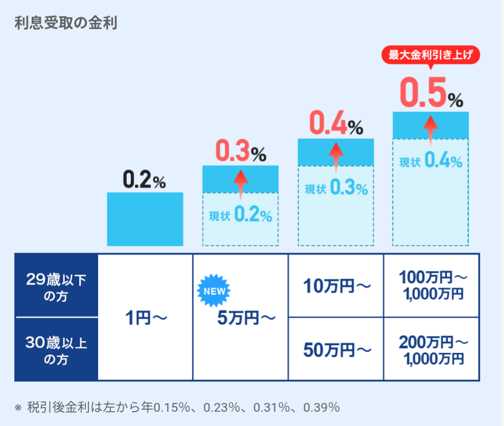 - 普通預金金利: 最大0.4% → 0.5%