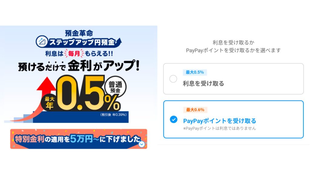 普通預金の利息の受け取りは、「PayPayポイント」か「現金」のどちらにするか選べます。