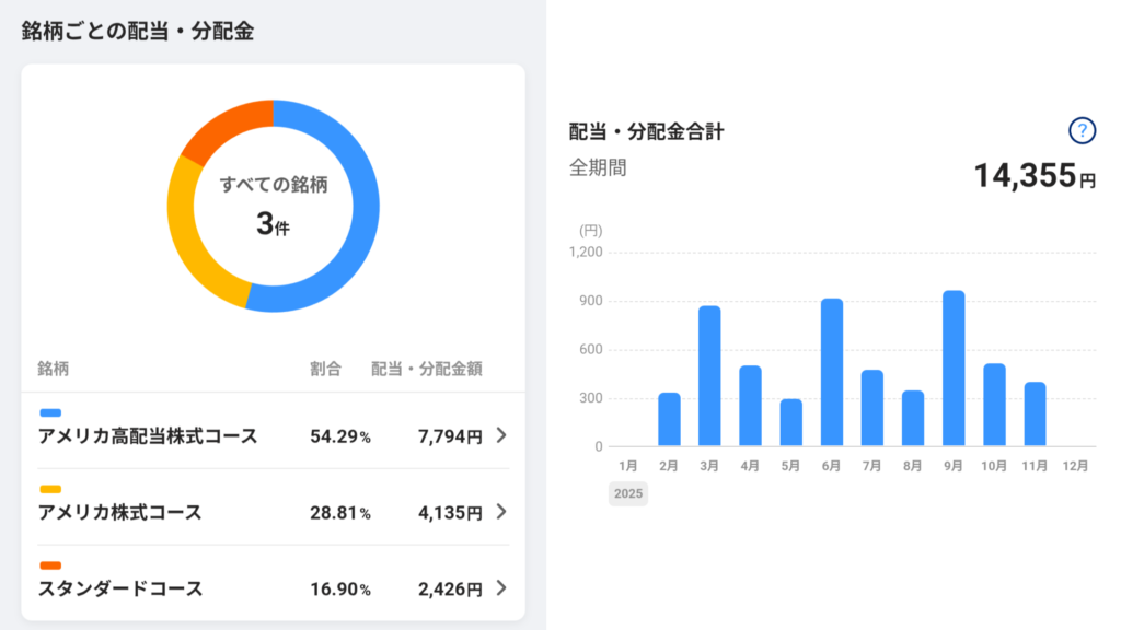 私は「アメリカ高配当株式コース(VYM)」「アメリカ株式コース(VTI)」「スタンダードコース(SPY)」で年4回の配当金を受け取っています。