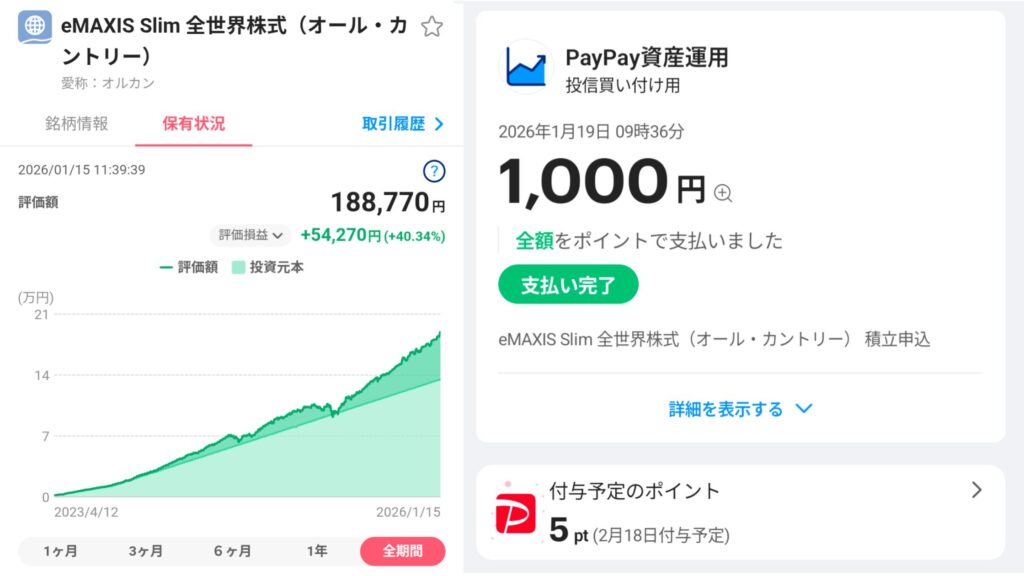 【PayPay資産運用】つみたて投資信託(全世界、S&P500)3年間の運用結果!